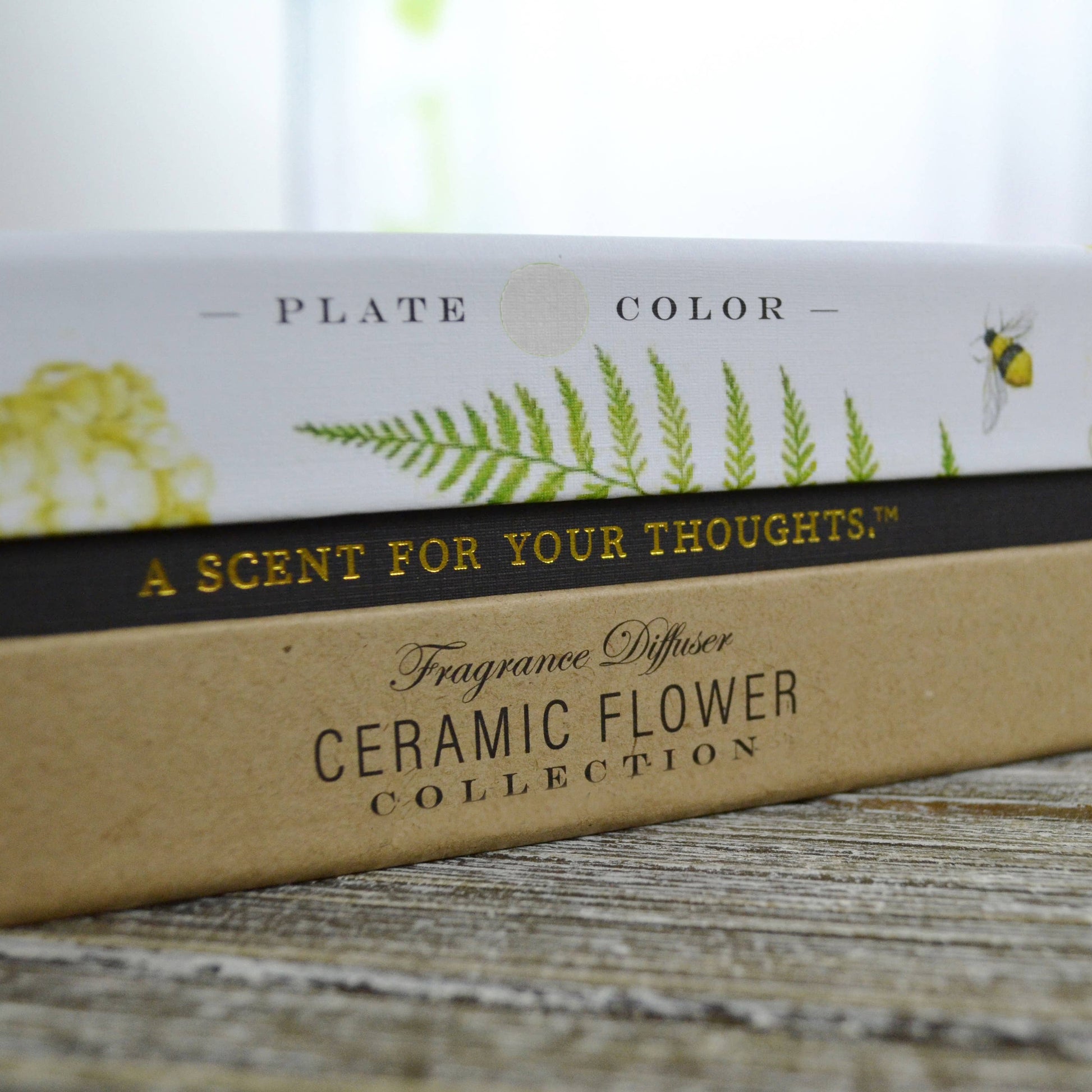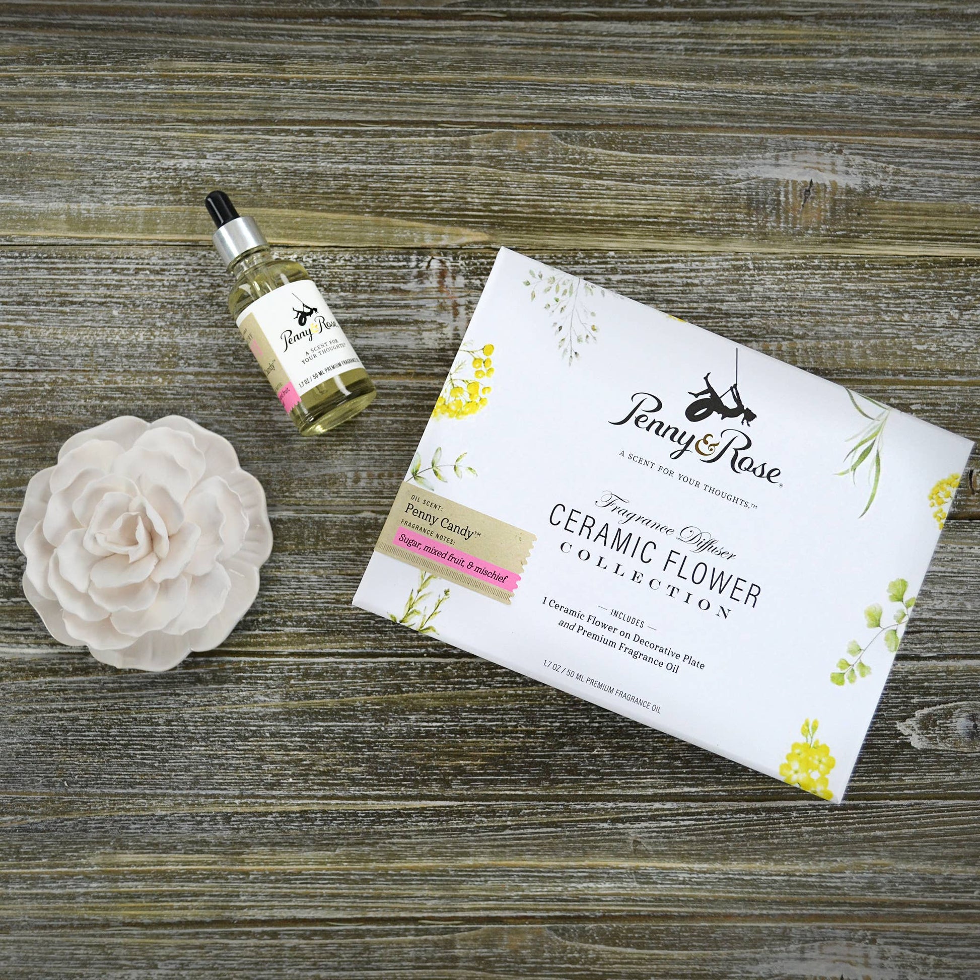 Set Contains: 1 Ceramic Flower Fragrance Diffuser on Decorative White Plate and 1.7 oz / 50 ml Premium Fragrance Oil